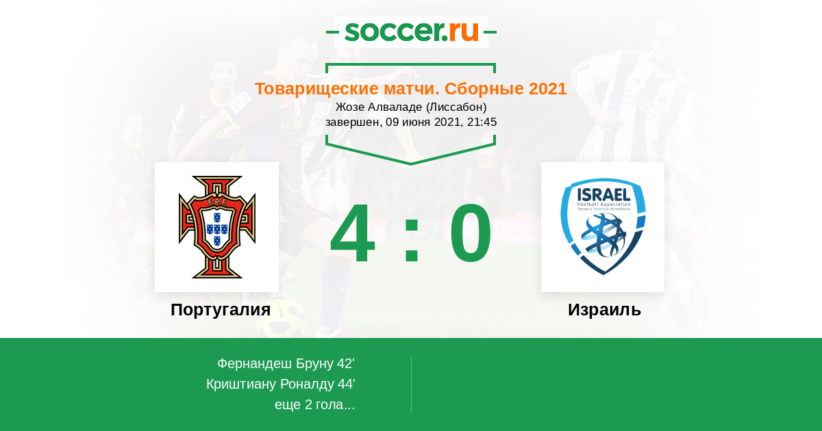 Португалия – Израиль - Роналду и Бруну завершат сбор перед Евро победой: прогноз ... : Португалия — израиль — 4:0 (2:0).. Португалия — израиль — 4:0 (2:0). Бруну фернандеш, 42, 90+1, криштиану роналду, 44 португалия: Силва, пепе, жоау канселу, рубен диаш (данилу перейра, 62), нуну мендеш. Силва, пепе, жоау канселу, рубен диаш (данилу перейра, 62), нуну мендеш. Руй силва, пепе, рубен диаш (данилу перейра, 62), жоау канселу, мендеш.